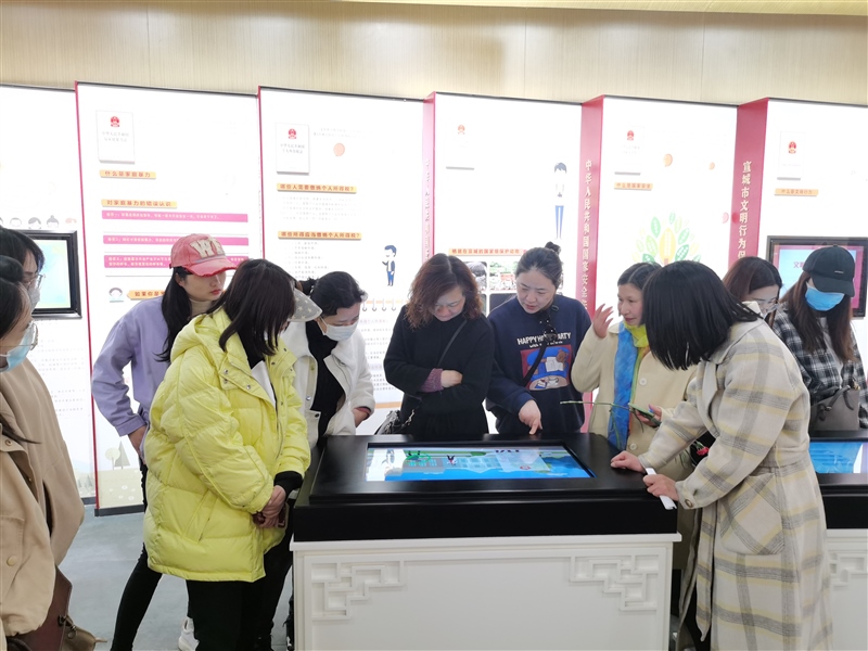 隨后,“娘子軍”們前往宣城宛陵湖法治文化館參觀。大家認真聆聽講解員的講解,依次參觀了“尊法學(xué)法”“守法用法”“普法路上”三個展區(qū),現(xiàn)場學(xué)習(xí)了法治文化,觀看了宣城市普法宣傳片和法治故事短片,體驗了法治模擬場景。通過參觀學(xué)習(xí),進一步增強了她們尊法學(xué)法守法用法意識,將法治觀念融入今后工作和生活中,做到廉潔從業(yè),依法履職。